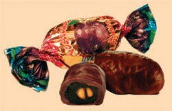 Конфеты глазированные шоколадом, корпус из чернослива с ядром ореха внутри.
