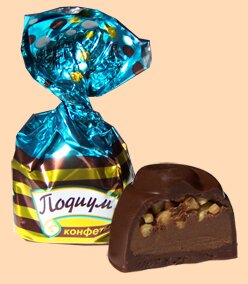 "Подиум" - конфета глазированная из черного шоколада, внутри кремовая начинка и дробленый орех.